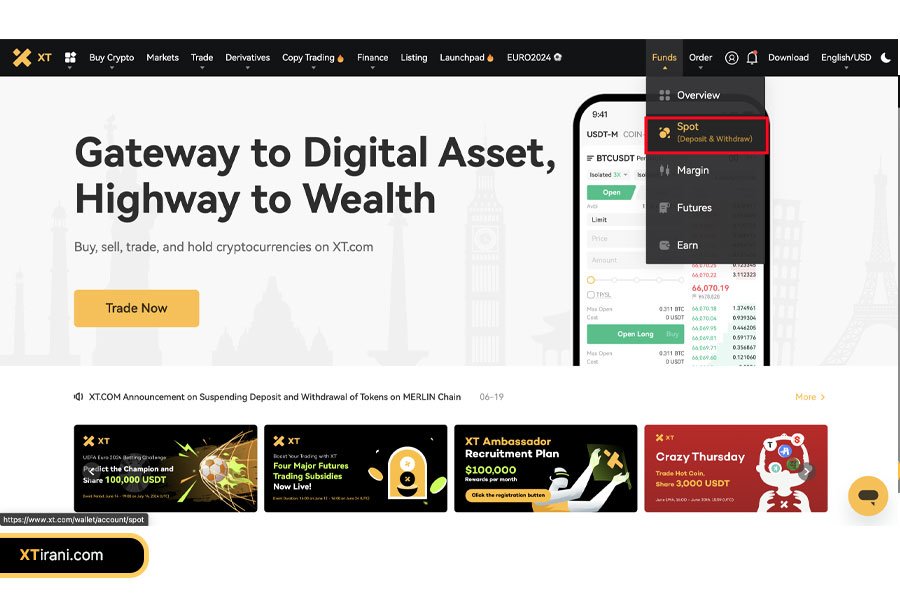 وارد حساب کاربری خود در صرافی XT شوید و از منوی بالای صفحه گزینه Spot را انتخاب کنید.