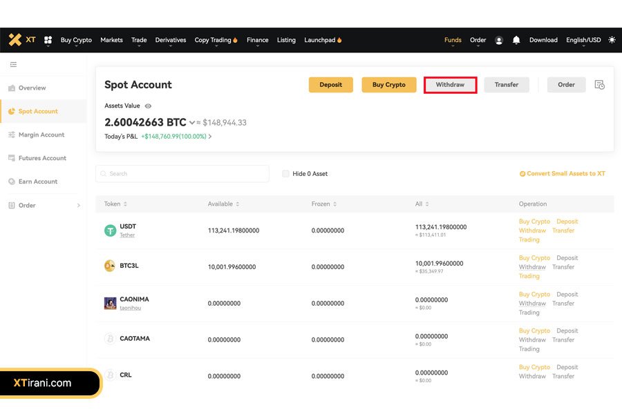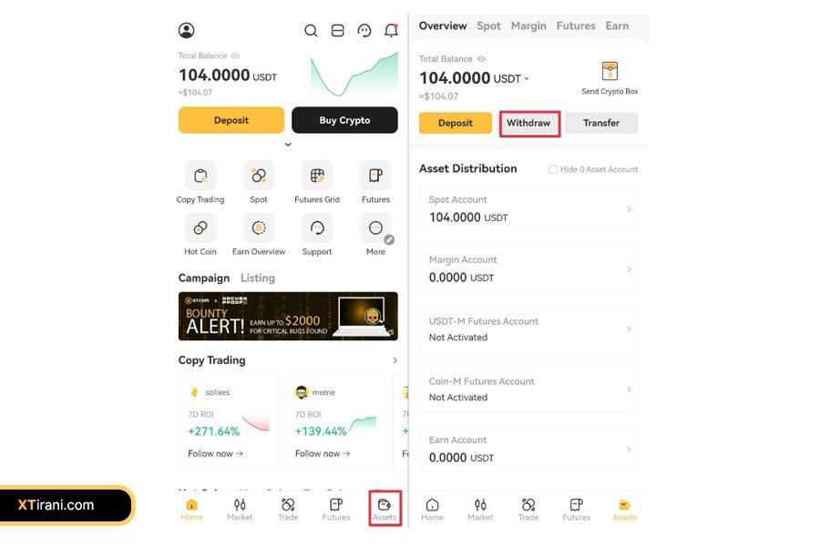 در قدم اول به حساب XT خود در اپلیکیشن وارد شوید و گزینه Assets را انتخاب کنید. سپس روی Withdrawal کلیک کنید.