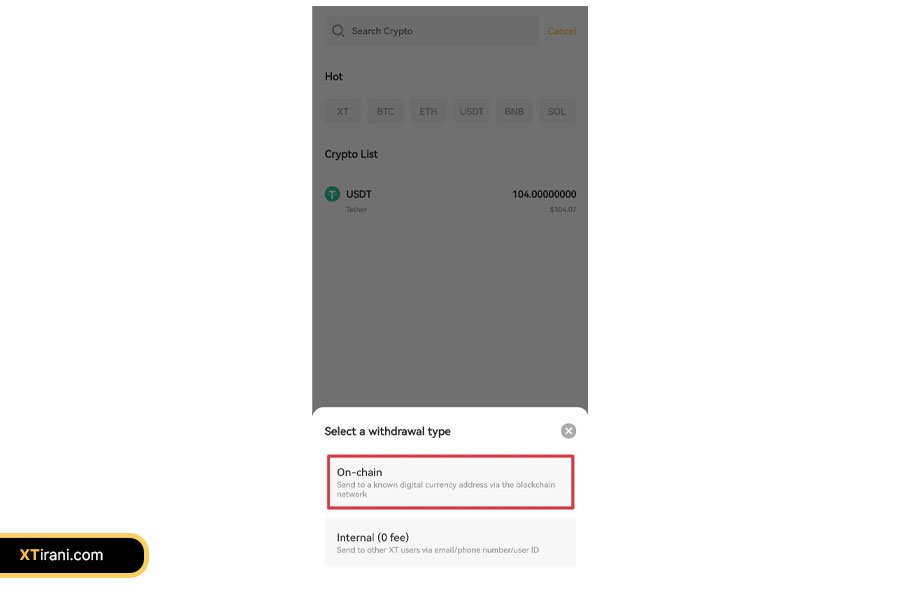 ارز دیجیتال مورد نظر خود را (مثلاً USDT) انتخاب کنید.