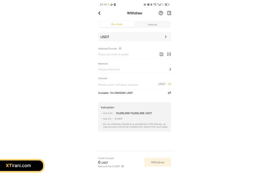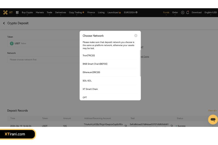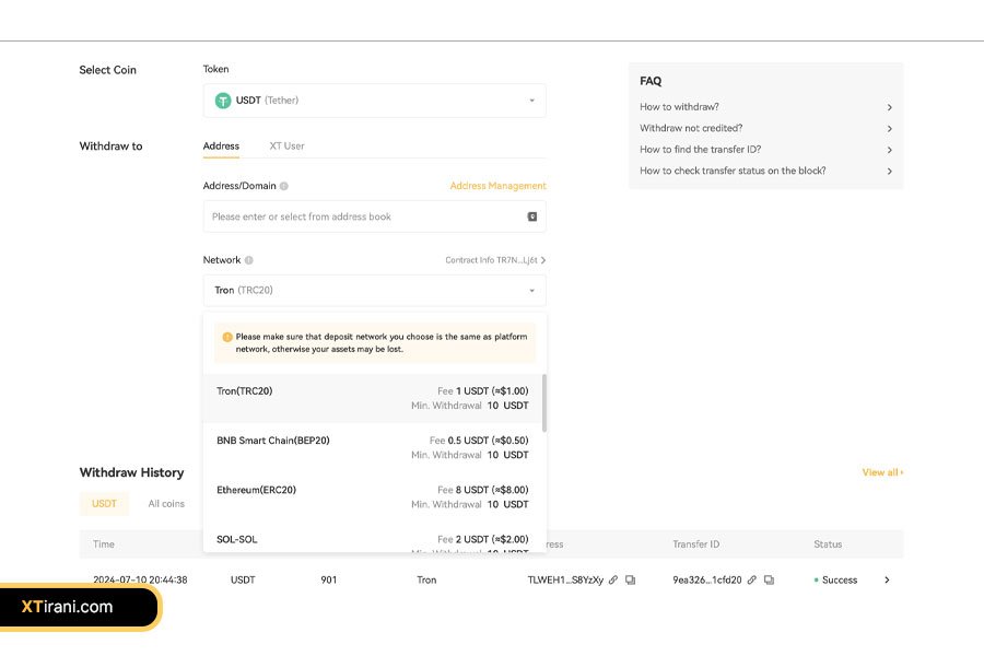 شبکه انتقال مرتبط با ارز دیجیتال انتخابشده نمایش داده میشود. اطمینان حاصل کنید که شبکهای که در صرافی XT انتخاب میکنید با شبکه انتقال در کیف پول یا صرافی مبداً همخوانی دارد. انتخاب شبکه اشتباه ممکن است منجر به از دست رفتن دارایی شود.