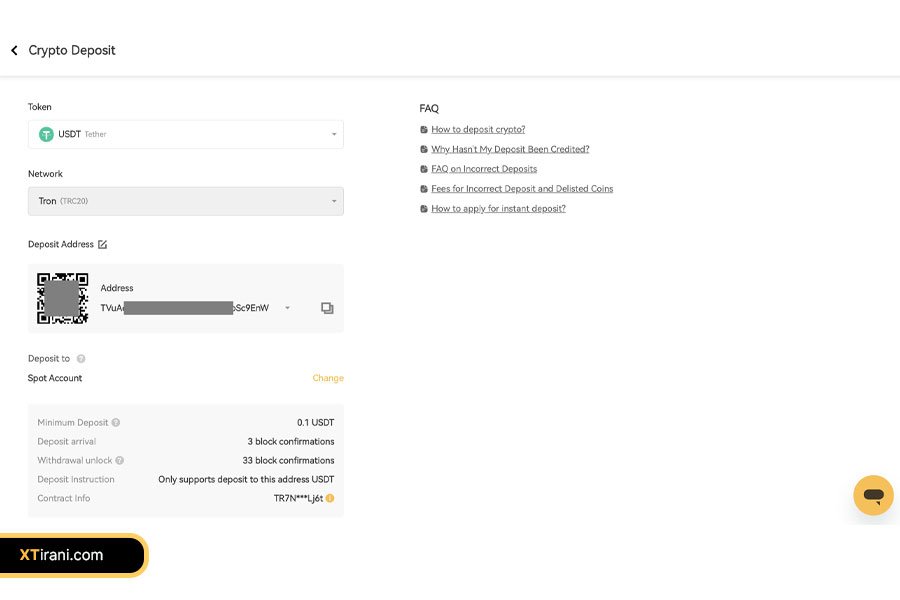 آدرس کیف پول مربوطه و کد QR نمایش داده میشود. میتوانید آدرس را کپی کرده و در بخش مربوط به آدرس در کیف پول یا صرافی مبداً قرار دهید و یا با استفاده از کد QR، آدرس را مستقیماً در کیف پول مبداً اسکن کنید.