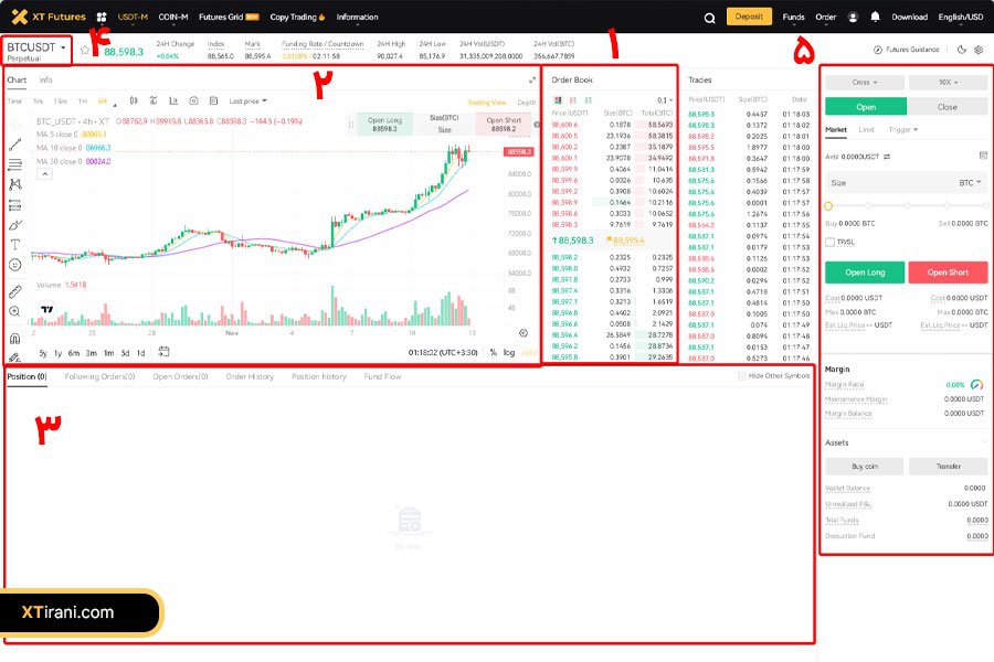 پنل معاملاتی فیوچرز در صرافی XT مکانی است که میتوانید انواع قراردادهای فیوچرز، مانند قراردادهای دائمی (پرپچوال) و انواع سفارشات را در بازار ارزهای دیجیتال معامله کنید. این پنل ابزارهای مختلفی را برای تحلیل بازار و اتخاذ تصمیمات هوشمندانه در اختیار شما میگذارد.